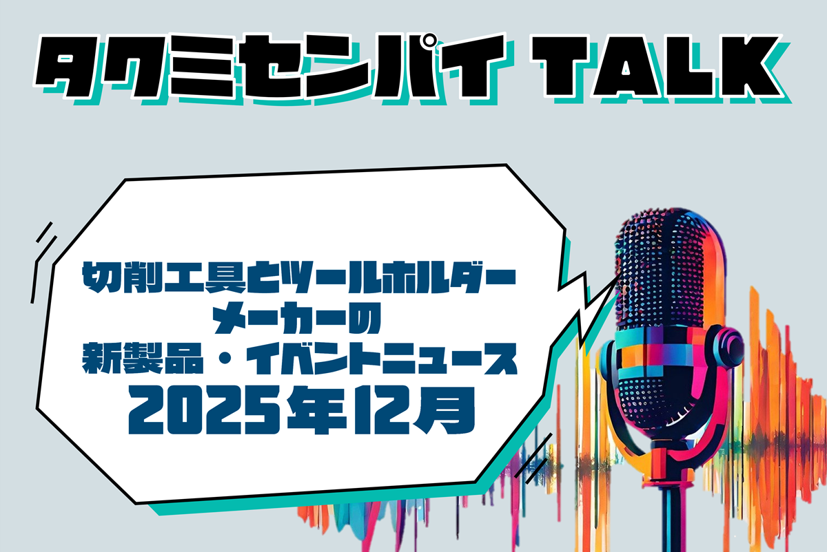 お知らせ タクミセンパイTALK「切削工具とツールホルダーメーカーの新製品・イベントニュース 2025年12月」公開 2026/04/07 切削工具とツールホルダーメーカーの新製品とイベントニュースについて、公式サイトで2025年12月に公開された情報をまとめたタクミセンパイTALK(YouTube・Spotify・Apple Podcast)を公開しました。 <関連記事リンク> 【2025年12月】切削工具メーカーの新製品・イベント最新ニュースまとめ